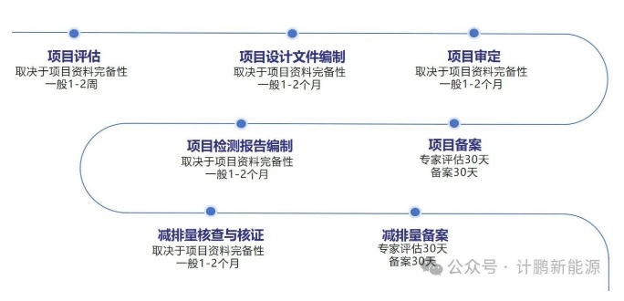常規申報流程包括:項目文件設計、項目審定、項目備案、項目實施與監測、減排量核查與核證、減排量簽發。
