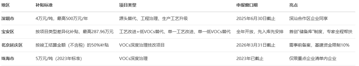 2025年3月,深圳市生態(tài)環(huán)境局與財(cái)政局聯(lián)合發(fā)布《關(guān)于開展工業(yè)源揮發(fā)性有機(jī)物(VOCs)減排項(xiàng)目補(bǔ)貼工作的通知》(深環(huán)〔2025〕45號(hào)),按4萬元/噸的標(biāo)準(zhǔn)對(duì)減排量進(jìn)行補(bǔ)貼,單個(gè)企業(yè)年度補(bǔ)貼上限達(dá)500萬元。